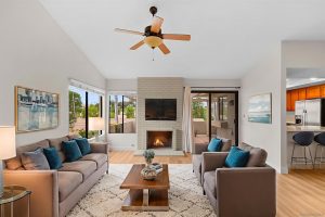 SURE TO PLEASE! OPEN, AIRY, LITE AND BRIGHT, TWO BEDROOM PLUS DEN/OFFICE END UNIT WITH HUGE NORTH VIEWS. BRAND NEW SWISS CREAM INTERIOR DECOR AND STYLE. FEATURES ELEGANT, NEW DESIGNER VINYL PLANK FLOORING/BASEBOARDS THROUGH OUT. LIGHTLY USED, LARGE AND FUNCTIONAL OAK KITCHEN W GRANITE COUNTERS, STAINLESS STEEL, BUILT-INS. SIZABLE MASTER SUITE W LARGE, SHELVED WALK-IN. EXPANSIVE CATHEDRAL CEILINGS, SKYLIGHTS, CEILING FANS. TWO PRIVATE PATIOS, LARGE MAIN WITH MOUNTAIN VISTA. HOME EXUDES A MODERN AND INVITING ATMOSPHERE. DELIGHTFUL, FRIENDLY COMMUNITY, GOLF, RECREATION CENTER, EXERCISE ROOM, POOL, SPA, TENNIS, PICKLEBALL, LAWN BOWLING AND MUCH MORE.